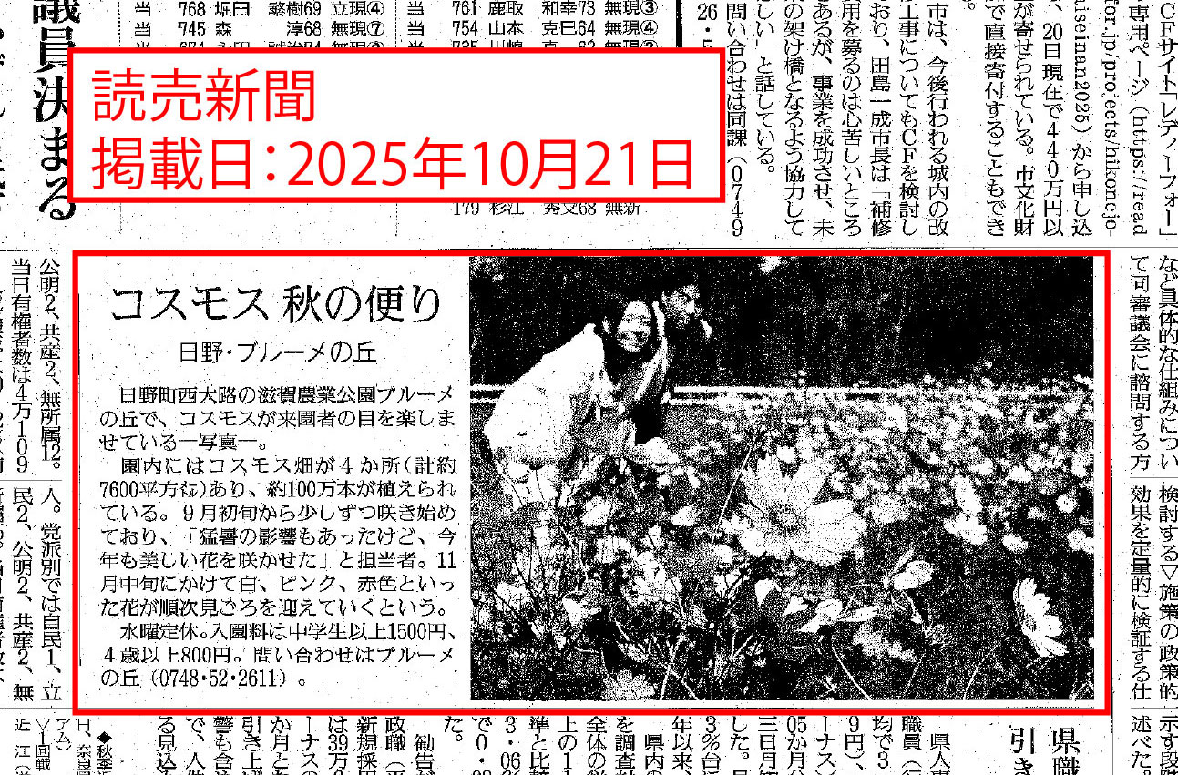 読売新聞にて、間もなく見頃を迎えるコスモスをご紹介いただきました。