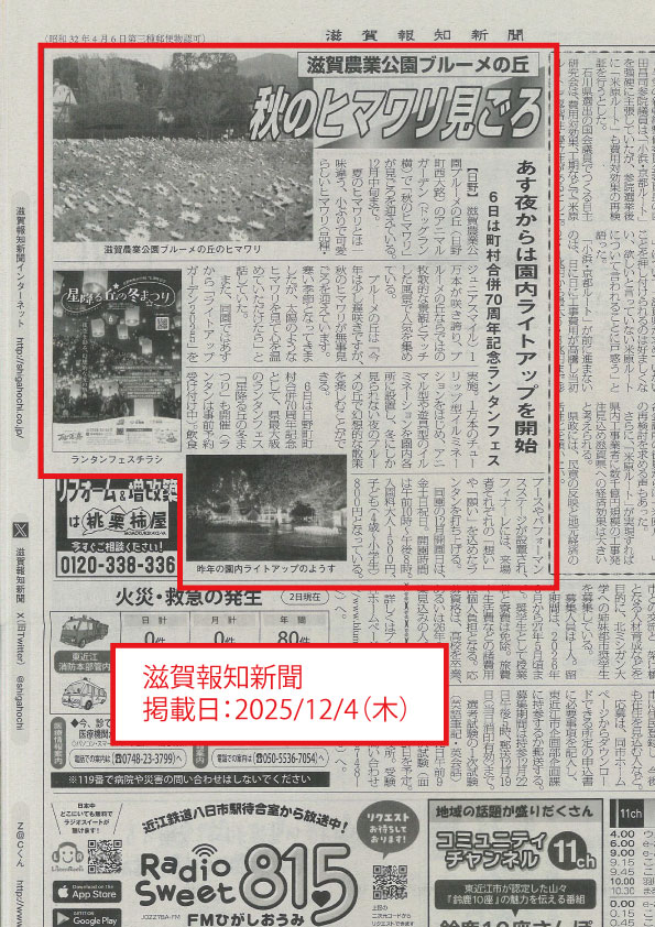 滋賀報知新聞にて、秋のヒマワリについて掲載されました。 また、12月5日から開催のライトアップガーデンについても紹介いただいております。
