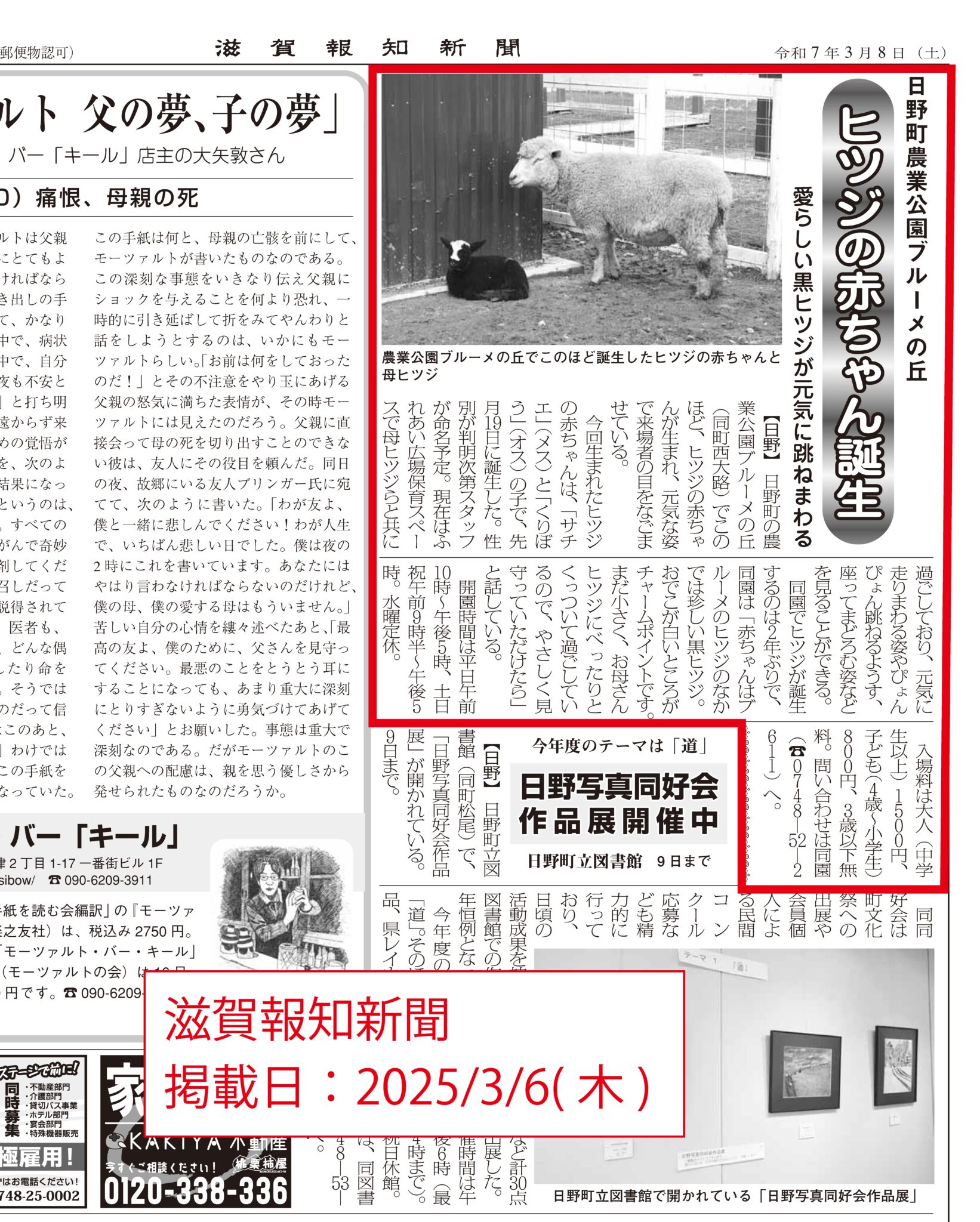 2025年2月19日にひつじの赤ちゃんが産まれまして、滋賀報知新聞にて紹介されました!